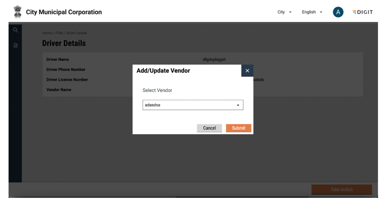 A pop-up will be displayed with a dropdown to select a vendor.  The user can select the vendor and click on submit or go back to the driver details page by clicking on ‘Cancel’.