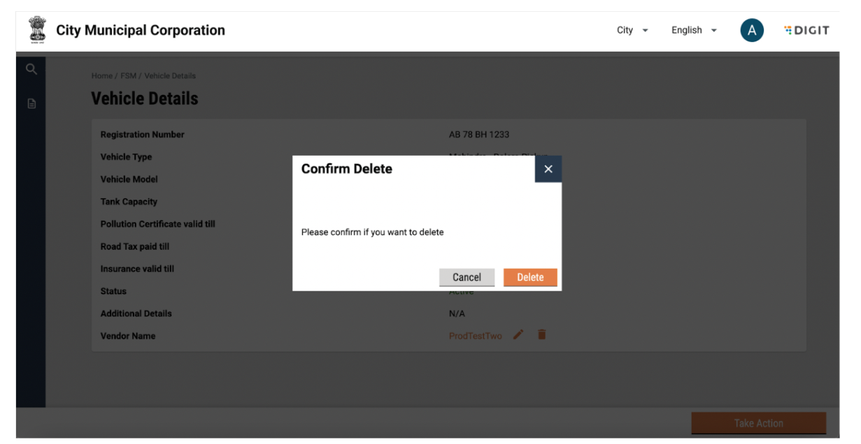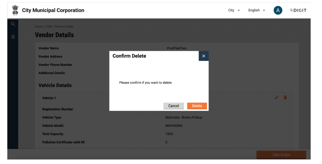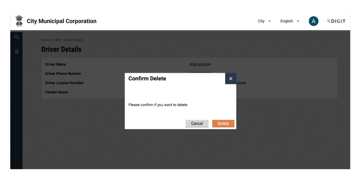 A pop-up will be displayed for confirmation. The user can click on delete to confirm or view driver details by clicking on cancel. The vehicle will be deleted.