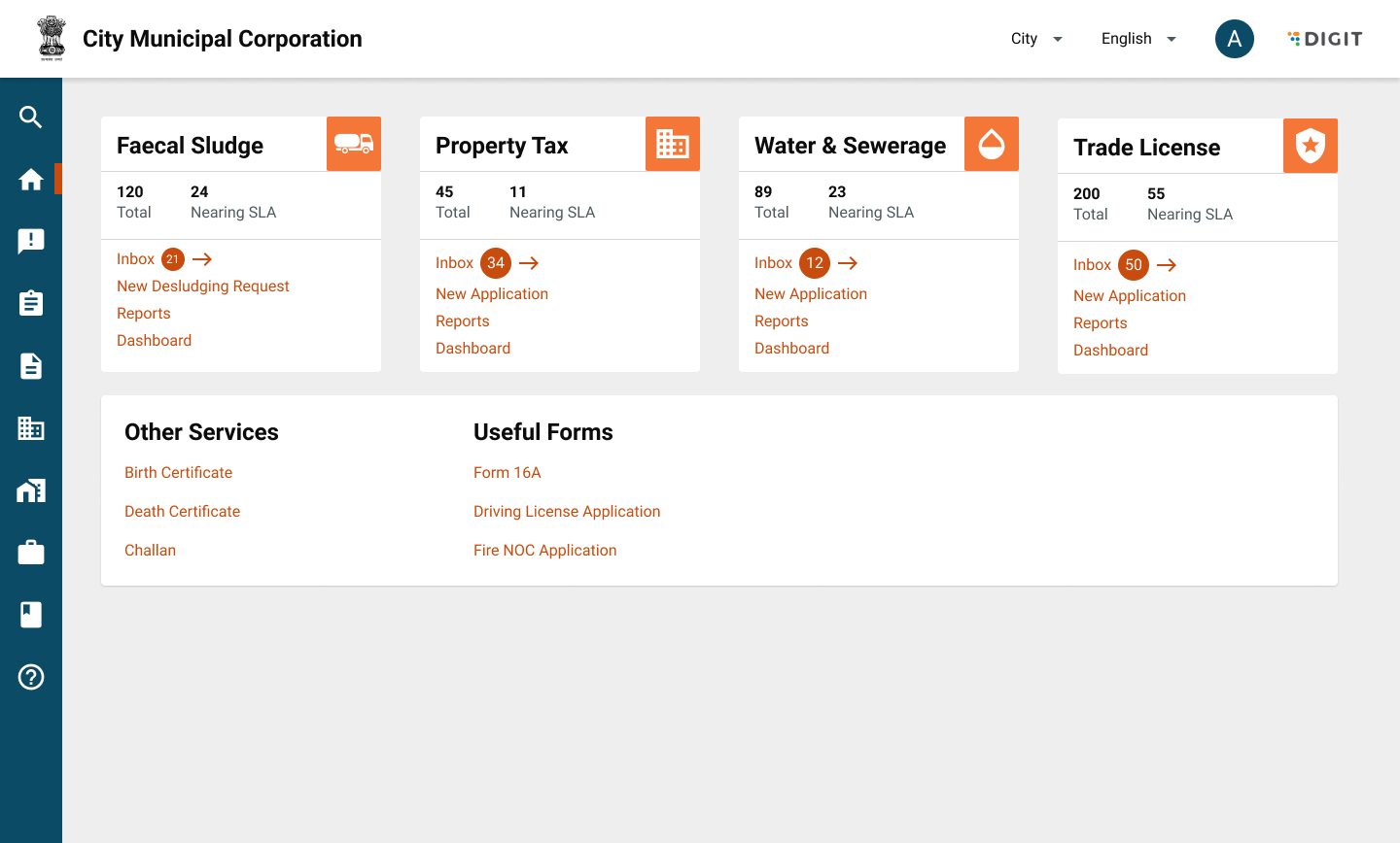 A landing page is available to a citizen on login.