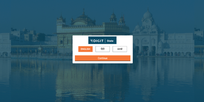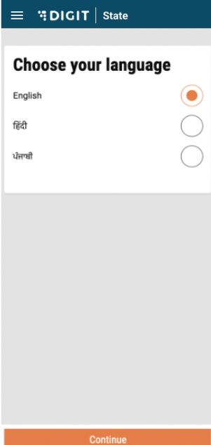 When the user opens the application, it asks them to first select the language. The selected language is highlighted in orange color. Once the user selects a language, he/she must click on the ‘Continue’ button which opens the login page.