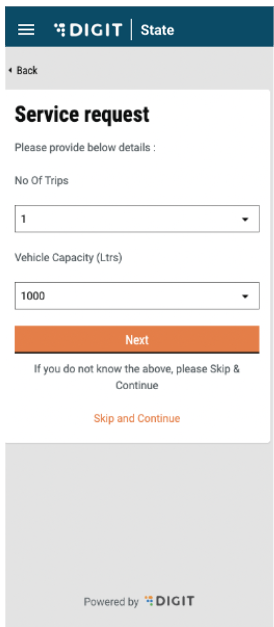 The user is prompted to enter the “No. of Trips” and the “Vehicle Capacity”. If the user knows the details, he/she can enter the details and click on ‘Next’. If not, the user also has the option to “Skip and Continue”.&#x20;