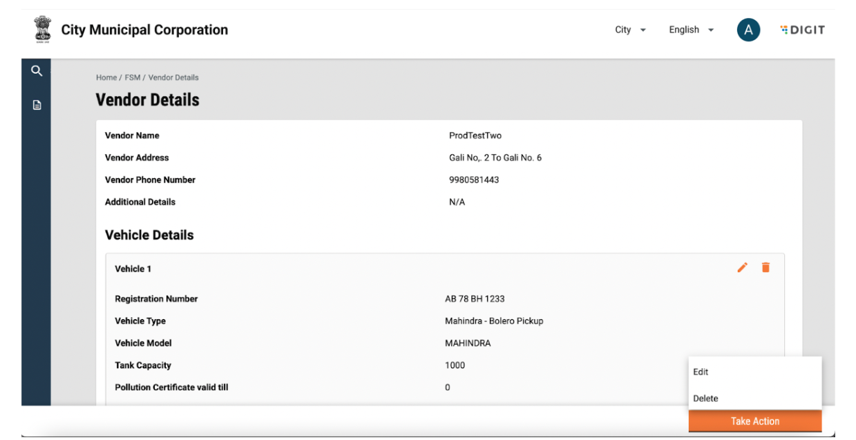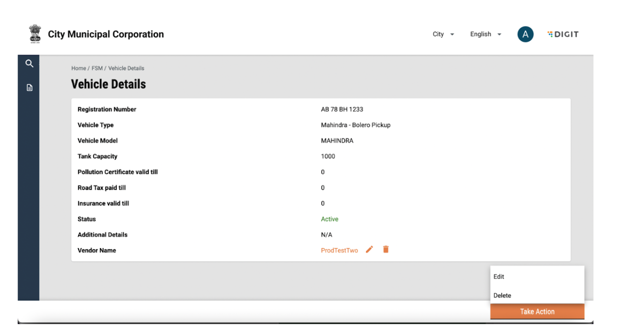 A vehicle can be deleted by clicking on the “Take Action” button and selecting delete.