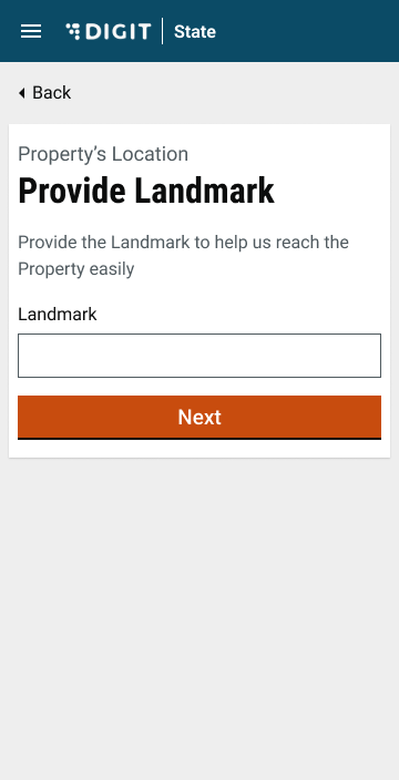 After this, the user will be redirected to the property address page where he/she will have to enter the “Street Name” and “Door/House No”. The ‘Next’ button will be deactivated and will be highlighted  once the user has filled in the details. Once a property address is provided, the user is asked to provide a landmark.