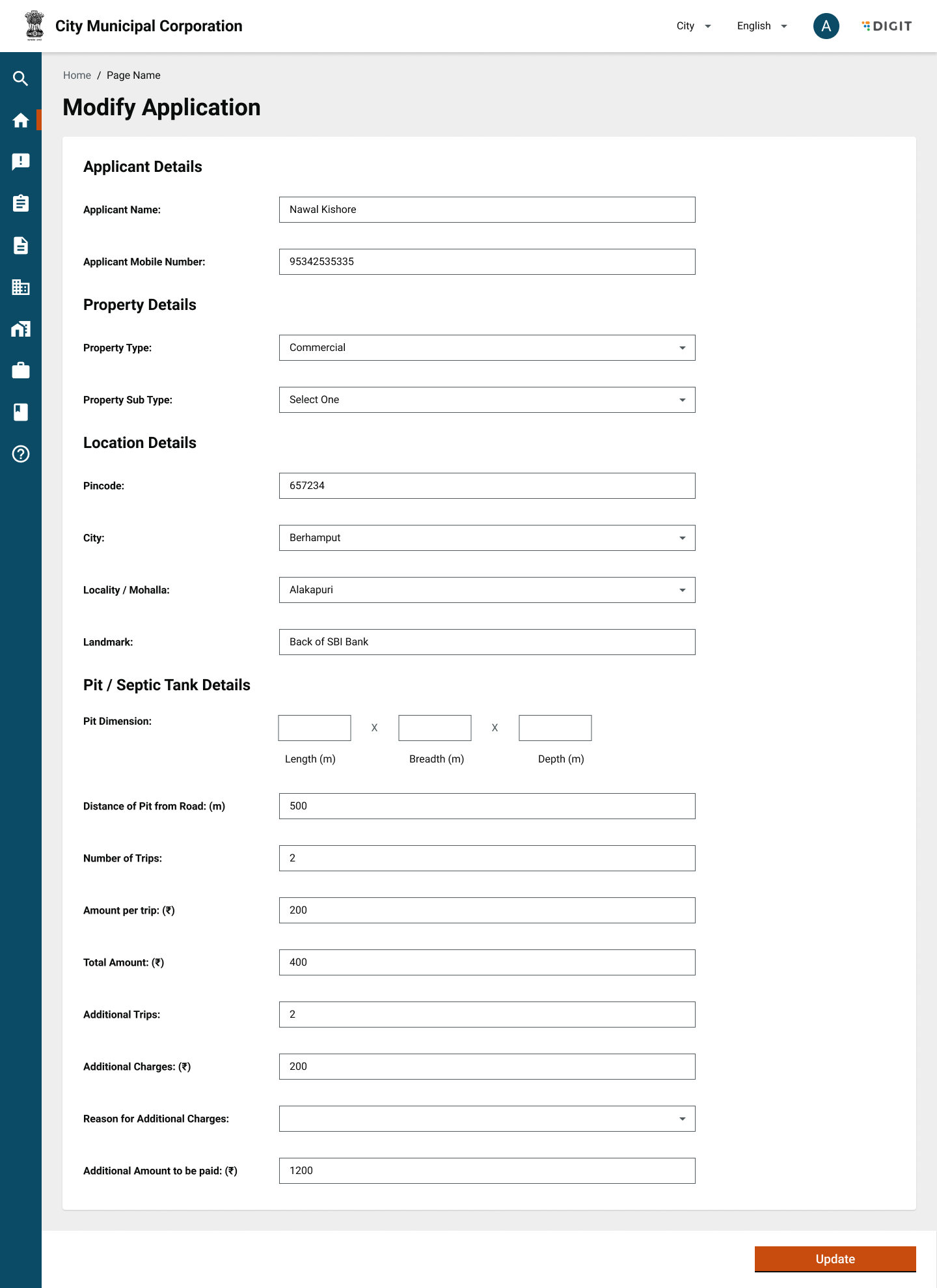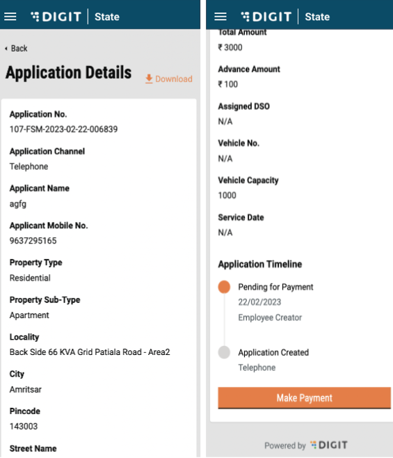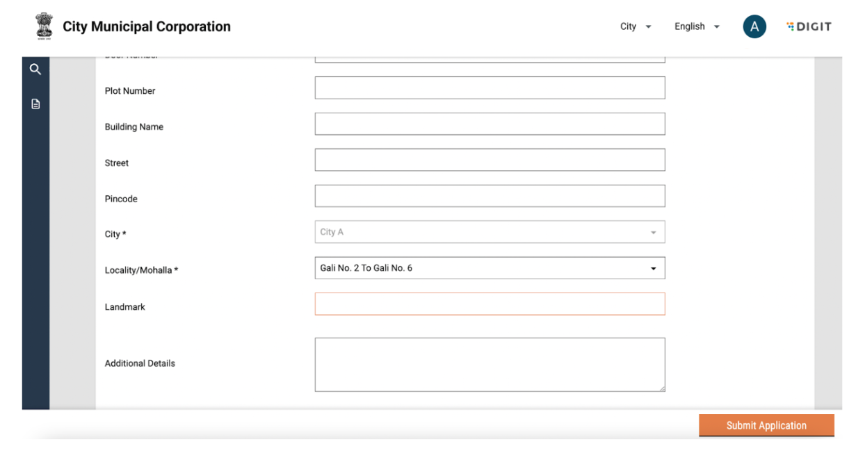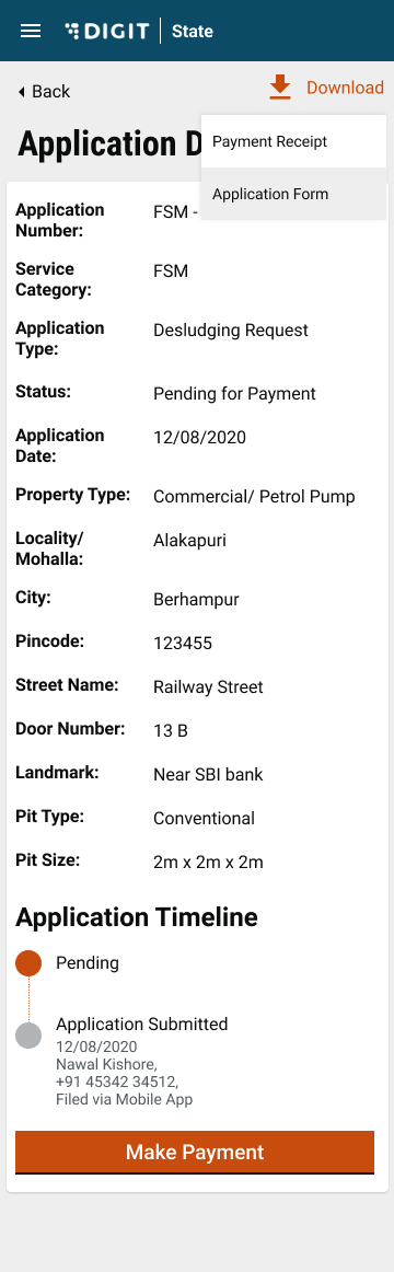 To view Past Applications, the user can navigate to Search Applications. Here, users can search for both Active and past applications with the following fields: Application Number, Mobile Number, Status and Locality. On clicking on an application number, the user is redirected to the Application details page.