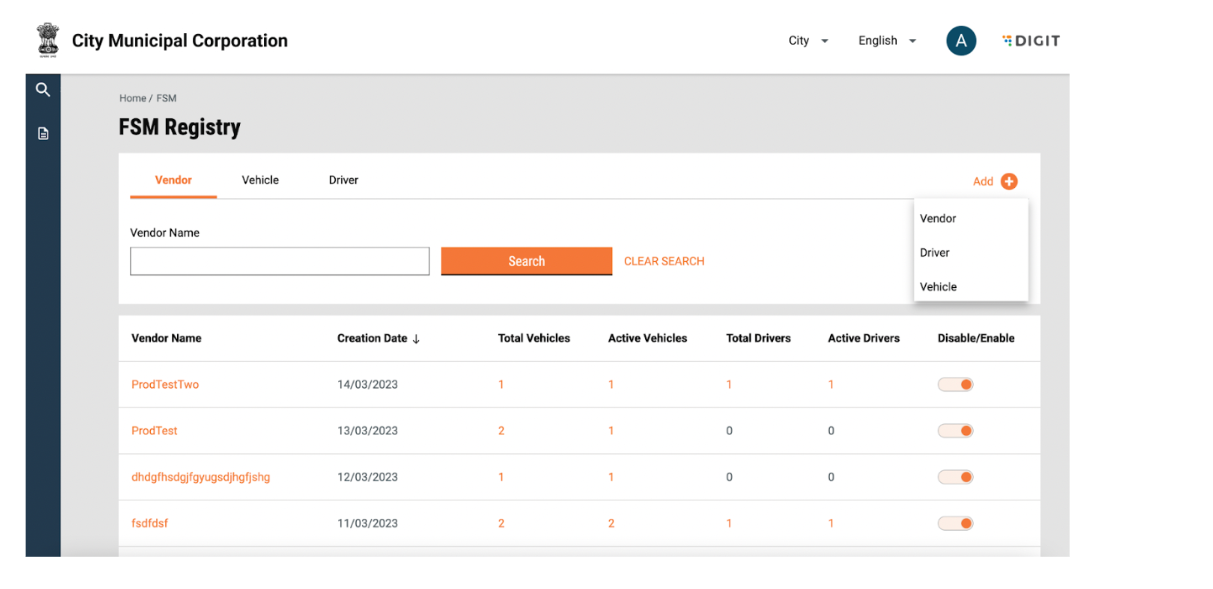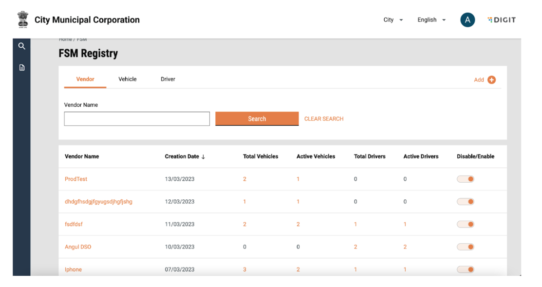 The landing page of the FSM registry is defaulted to show the list of vendors in the system. A particular vendor can be searched for by entering the Vendor name in the search bar. Search can be cleared by clicking on the “Clear Search” button.