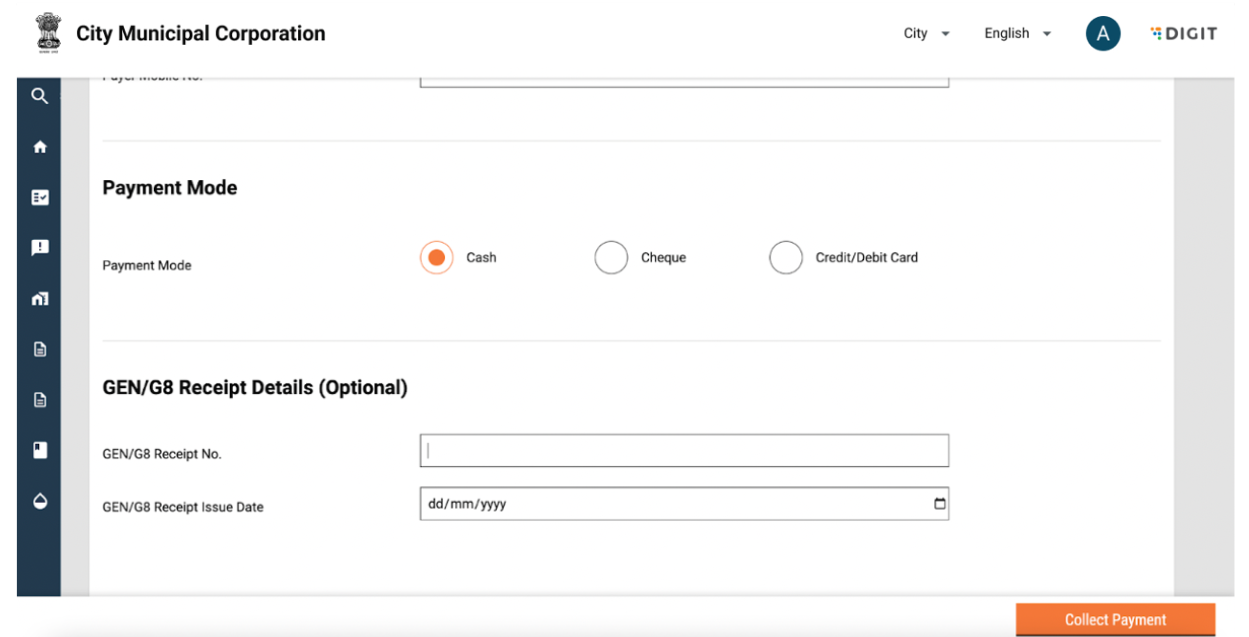 Users are redirected to this screen once they select the preferred language in the previous screen. The city field is a list with radio buttons based on the tenants that are configured in the instance, and the selected radio button is highlighted in orange. The selection of the city will determine the urban local body (ULB) where the application request is raised.