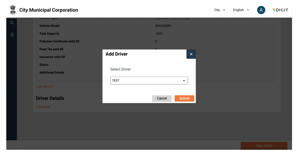A pop-up will be displayed with a dropdown to select a driver. Only drivers that are not tagged to any vendor will be displayed. The user can select the driver name and click on submit or go back to the vendor details page by clicking on close.&#x20;