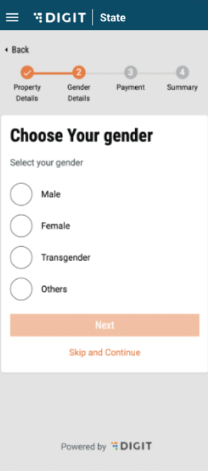 The user will be asked to select gender. The radio button for the selected option will be highlighted in orange.  If the user wants to declare their gender, the user can select from Male/Female/Transgender/Others, and click on ‘Next’. If not, the user also has the option to “Skip and Continue”.&#x20;