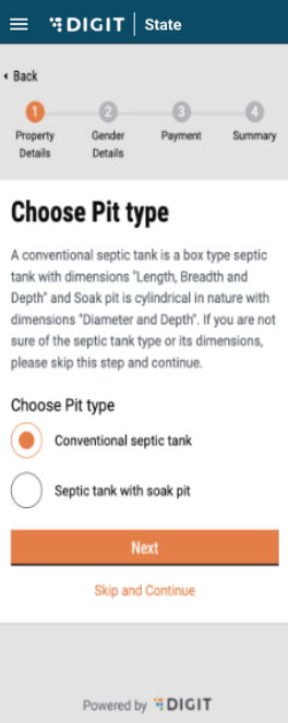 The user will be prompted to “Choose Pit type”. The radio button for the selected option will be highlighted in orange.  If the user knows the pit type, he/she can enter the details and click on ‘Next’. If not, the user also has the option to “Skip and Continue”.&#x20;