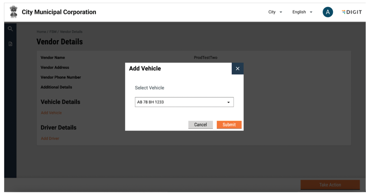 A pop-up will be displayed with a dropdown to select a vehicle. Only vehicles that are not tagged to any vendor are to be displayed. The user can select the vehicle number and click on submit or go back to the vendor details page by clicking on close.&#x20;