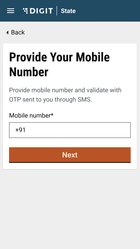 The mobile number entered in the application is for all communication purposes. All SMS communication will be sent to the user on the entered number. A user can also access the history of all past and active transactions using this number. The next button will only be deactivated and will be highlighted once the user has entered a valid number. An error message will be displayed if the number is not 10 digits, or alphabets/special characters are entered.&#x20;