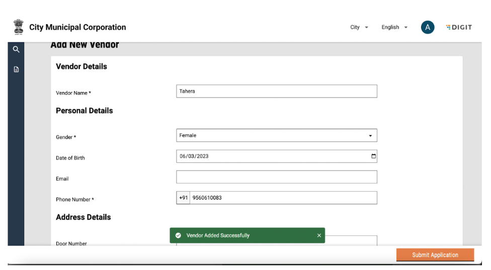Once the user submits an application, a snack bar will confirm the successful addition of a vendor and details of the added vendor will be displayed in the vendor list.&#x20;
