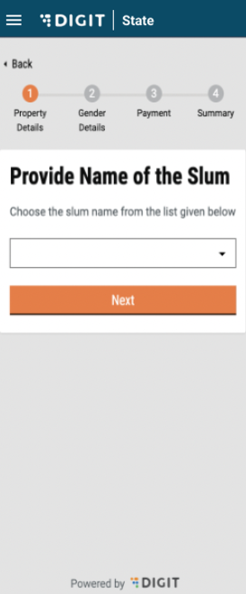 The slum name can be selected from a dropdown. The next button will only be deactivated and will be highlighted once the user has selected a slum name. On clicking ‘Next’, the user is redirected to the property address screen.&#x20;