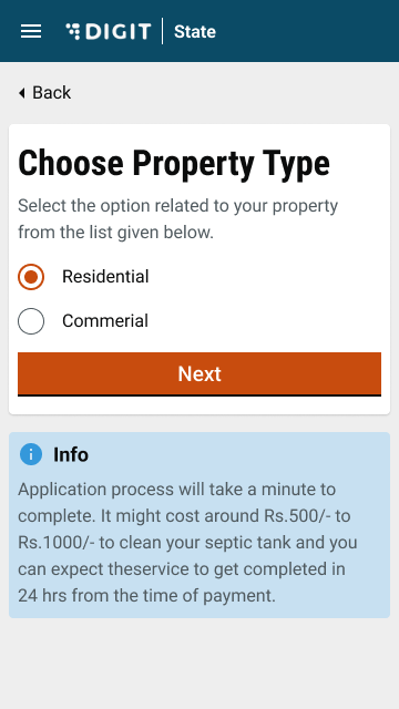 Based on the property type selected, an information box is displayed to the user informing them about the approximate cost of desludging. On clicking next, the user is prompted to “Choose Property Sub-Type”: