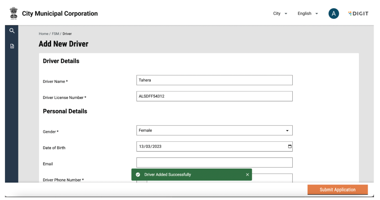 The user can confirm the completion by clicking on the ‘Submit’ button. The user can also go back to the FSM Registry landing page by using the breadcrumbs. Once the user submits an application, a snack bar will confirm the successful addition of a driver. Details of the added driver will be displayed in the driver list.