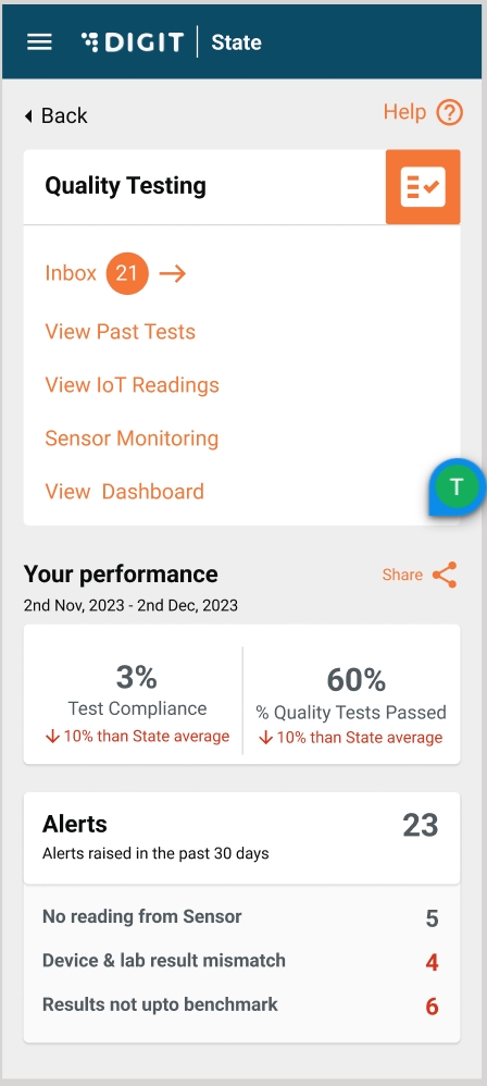 The "Your Performance" card shows relevant metrics such as test compliance and the percentage of tests that passed which shows the efficiency of the plant(s) linked to the logged in user.