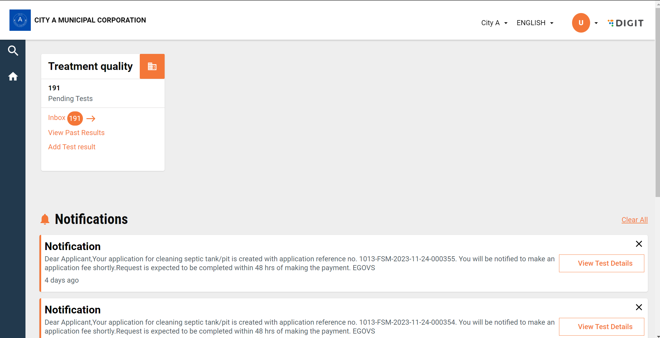 A notification card is available on the bottom, which is specific to TQM. All the TQM-related notifications configured will show up here. Currently, it shows notifications for tests whose results are not updated on time (crossed scheduled date).