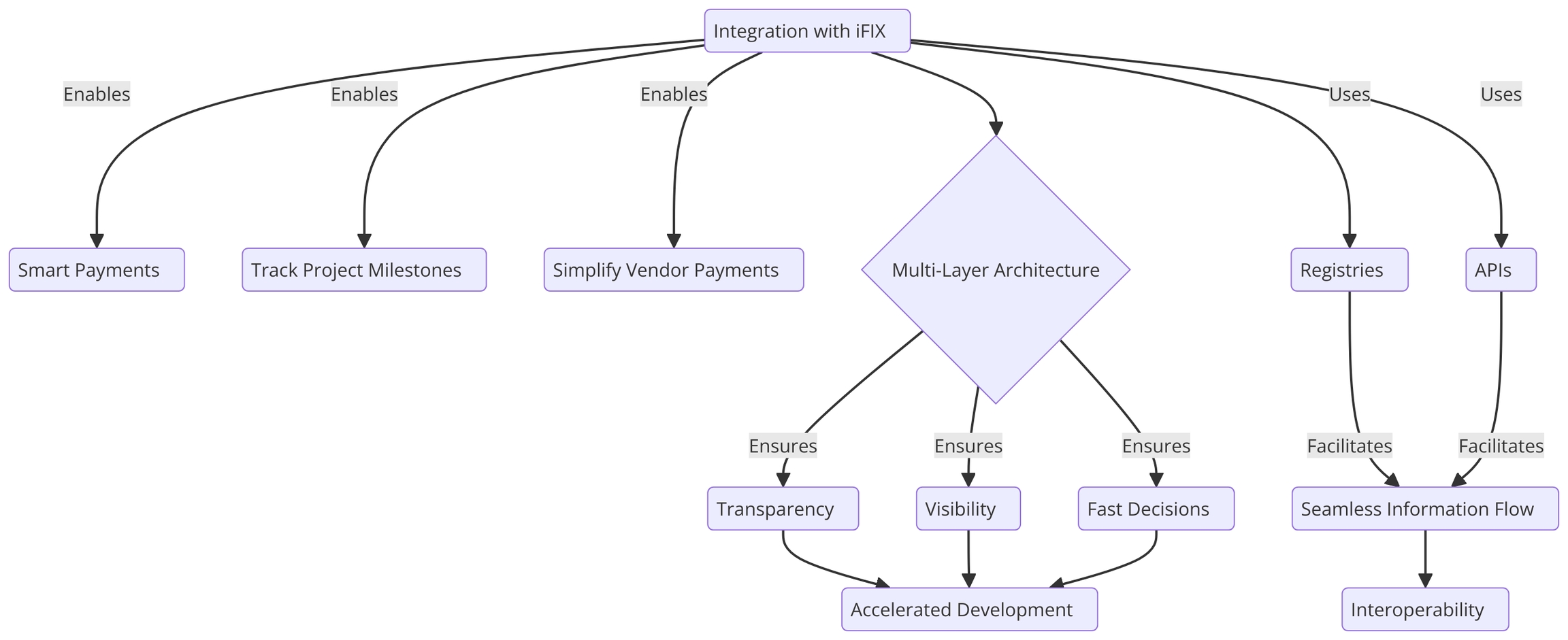 The platform design provides the capability to integrate smart payments with iFIX. The integration enables departments to track project milestones and simplify vendor payments. The multi-layer architecture design ensures transparency, visibility and fast decisions all of which translate to an accelerated pace of development. The registries and APIs ensure information flows seamlessly across channels removing the challenges of siloed data structures and facilitating interoperability.