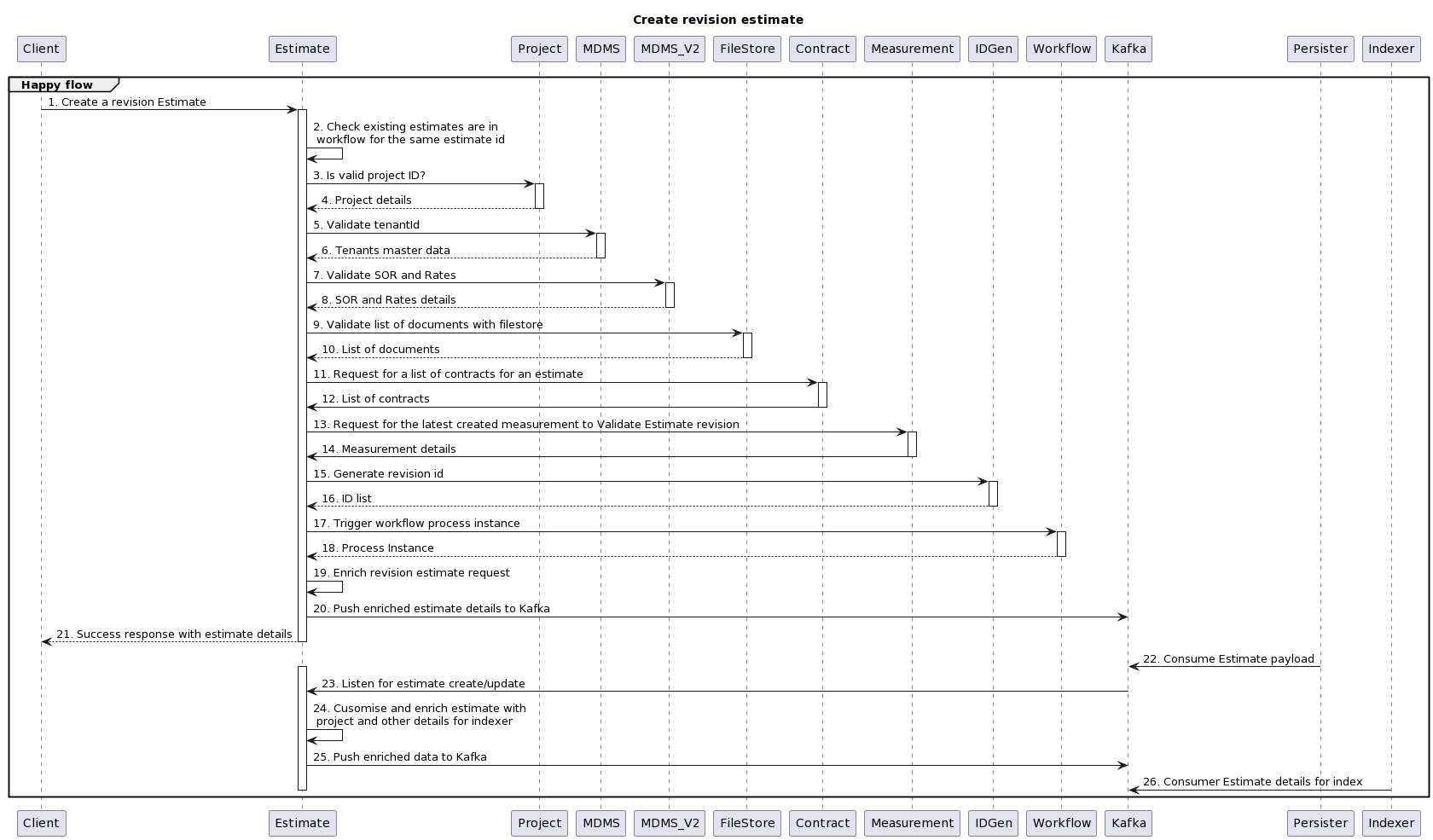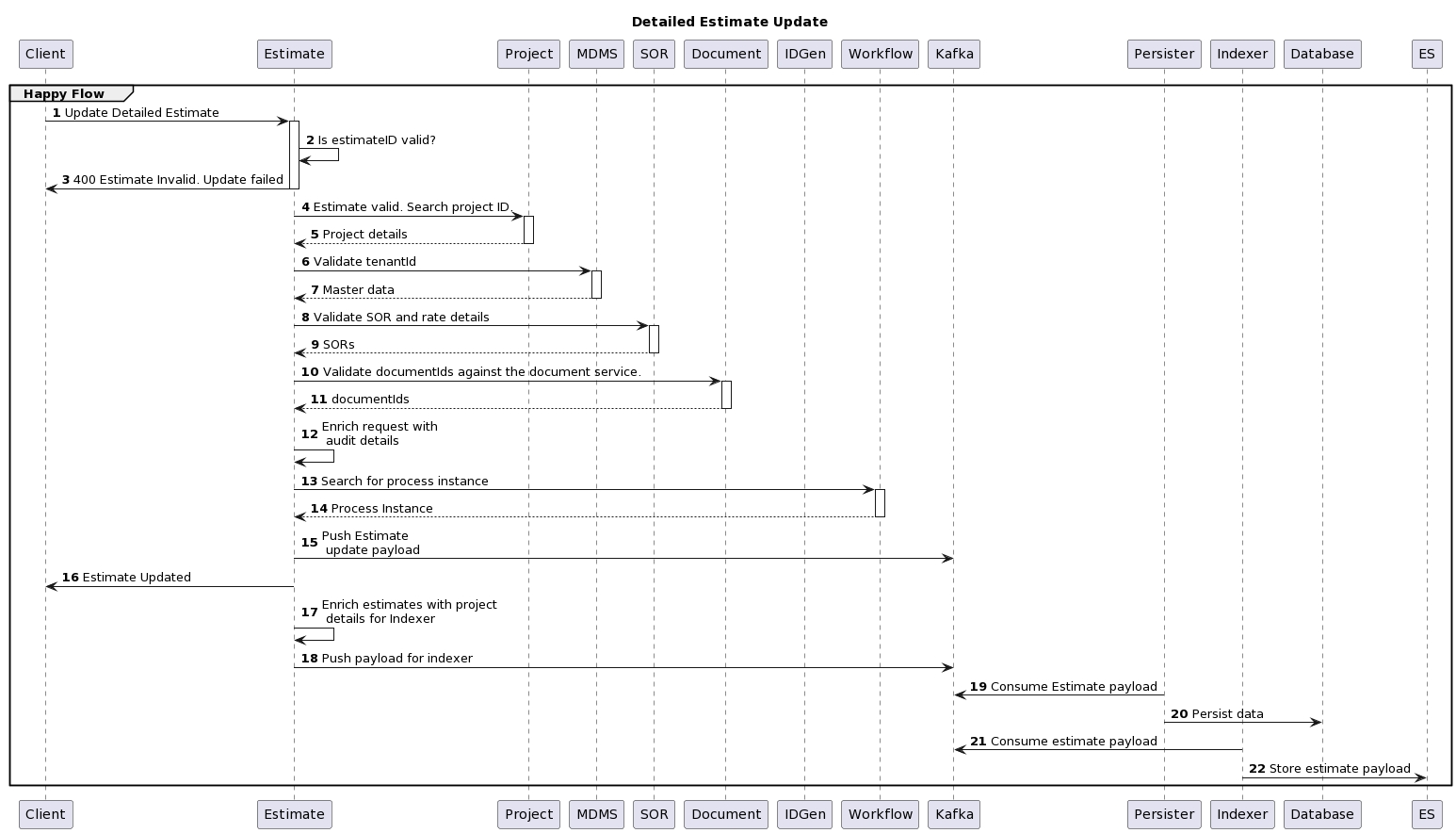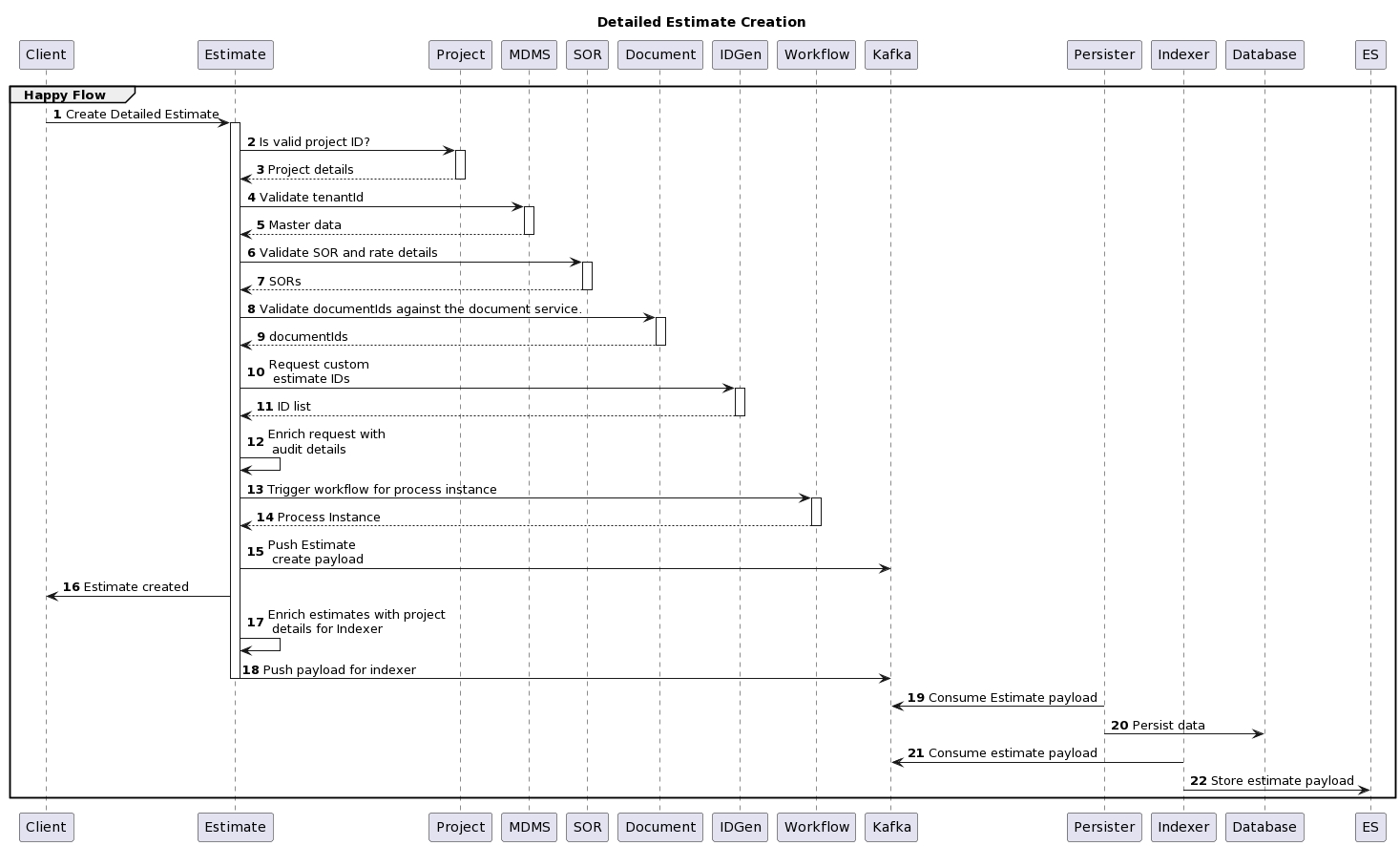 The diagram below shows the interaction between the estimate service and the persister, indexer. This does not follow the default pattern. Instead, enrichment of the payload for the indexer happens via a separate consumer and then the enriched payload is pushed to a topic. The indexer listens to this topic and sends it to ElasticSearch.