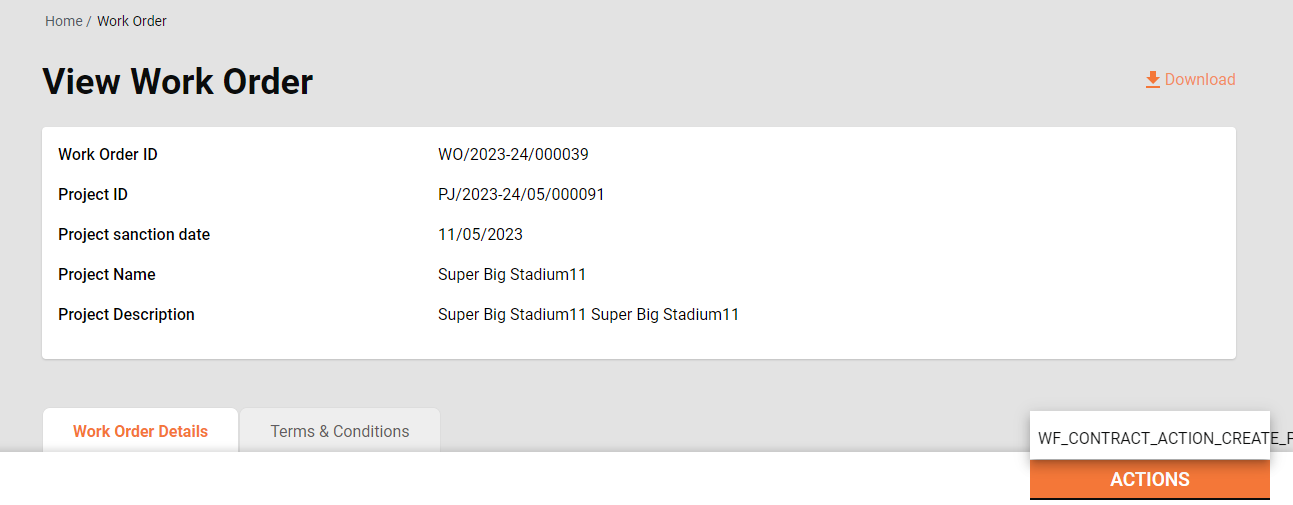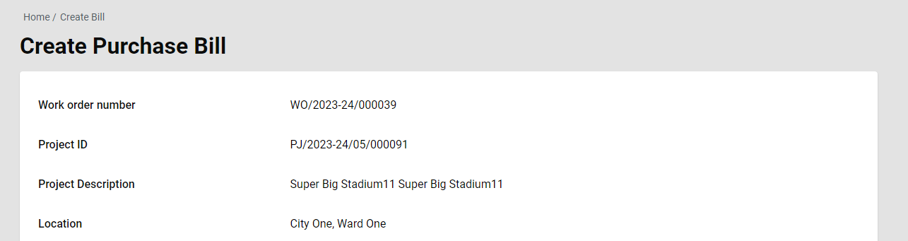 To create a bill for a project, the work order for the project is searched using the search work order and opened to view the details. Then from the view work order page, the action Create Purchase Bill is clicked. Other bills, wages and supervision are created automatically.