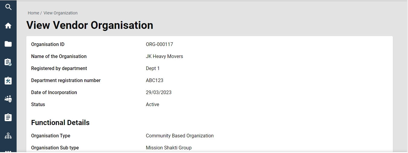 Home > Sidebar Menu/ Homepage > Organisation > Search Organisation > Organisation ID > View Vendor Organisation