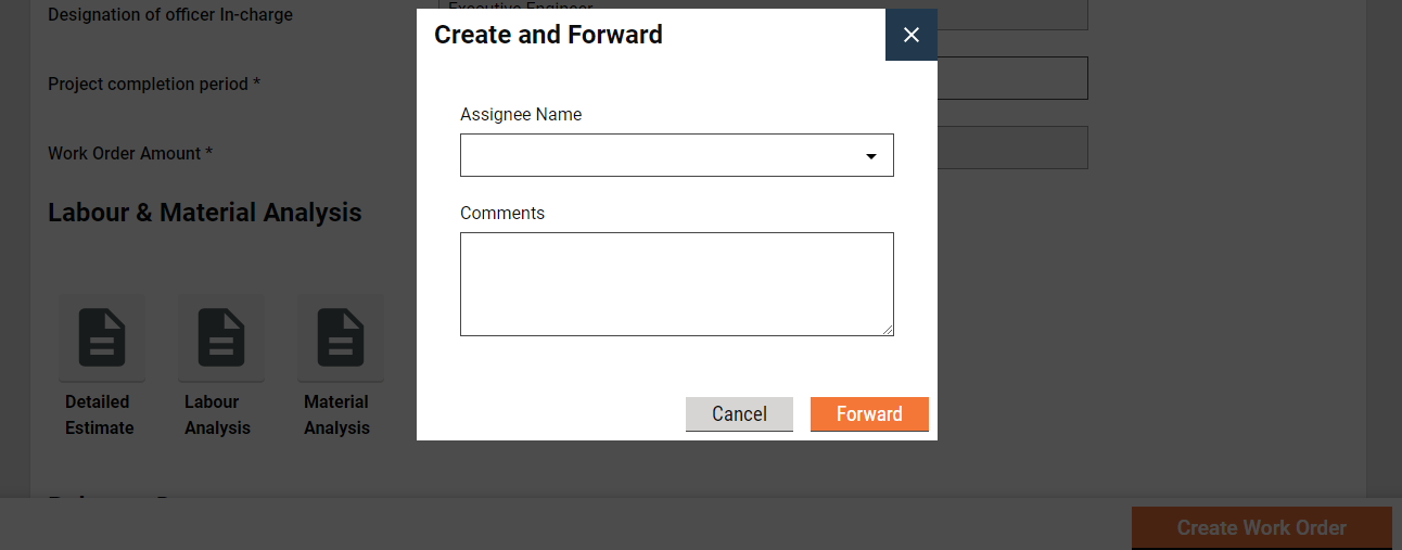 The work order creator (WC) has the right to create a work order for a project and then forward it to the verifier. On creation, the WC gets the forward dialogue box from which the user optionally selects the verifier’s name as the assignee name, adds the comments if any, and then forwards the work order.