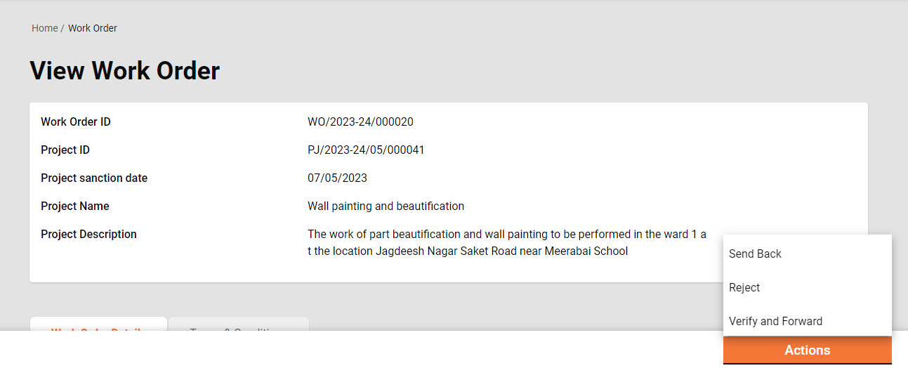 The Approver verifies the work order and if the documents and information provided in the work order are found satisfactory, complete and as per the guideline, the work order is approved.