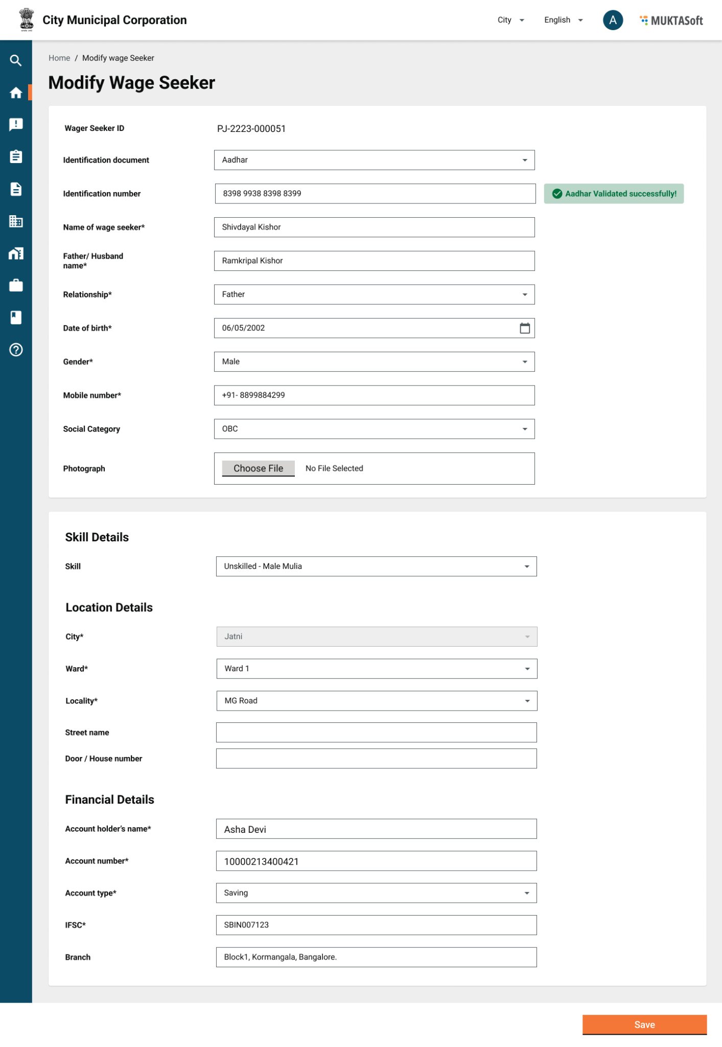 A wage seeker can only be modified by a ULB user who has access to do so. While modifying already existing wage seeker’s details proper identity details are captured and in the case of AADHAAR it is validated from the AADHAAR system.