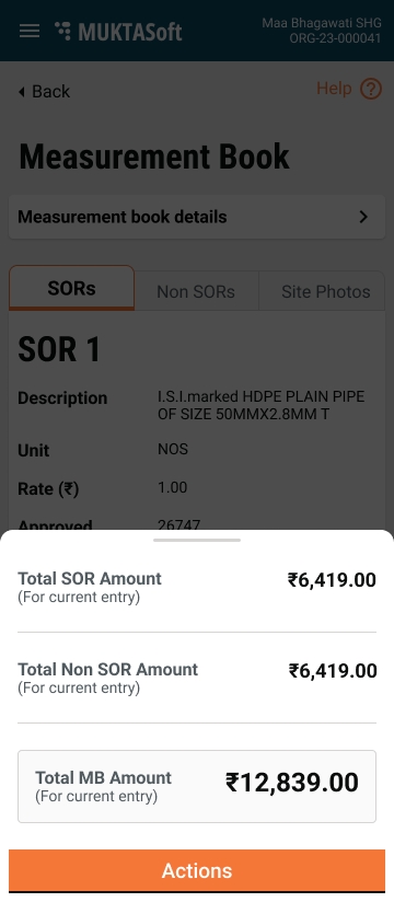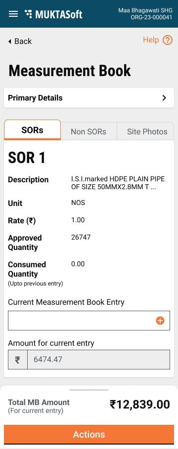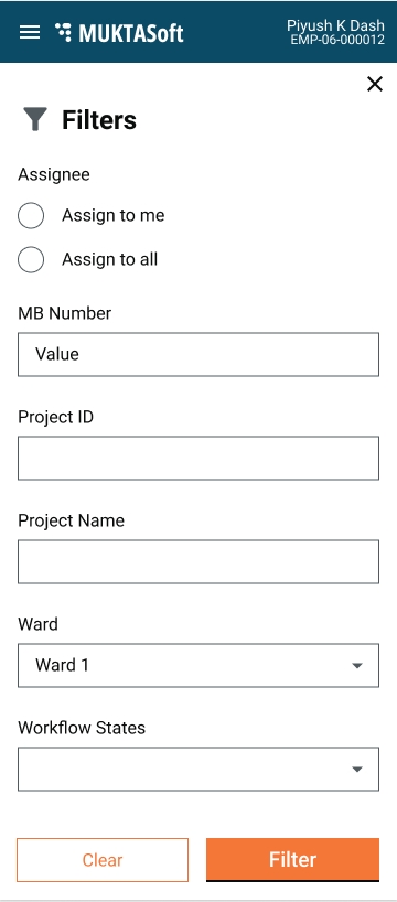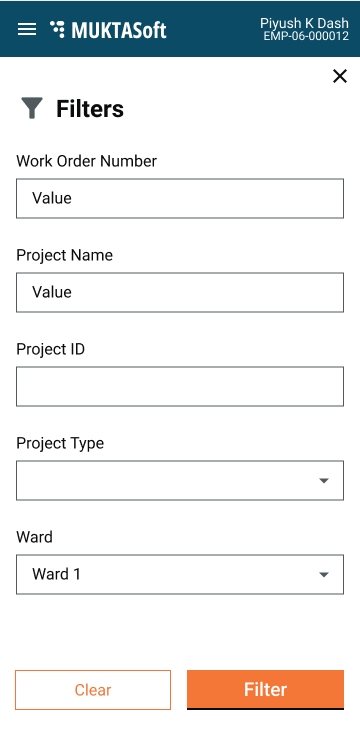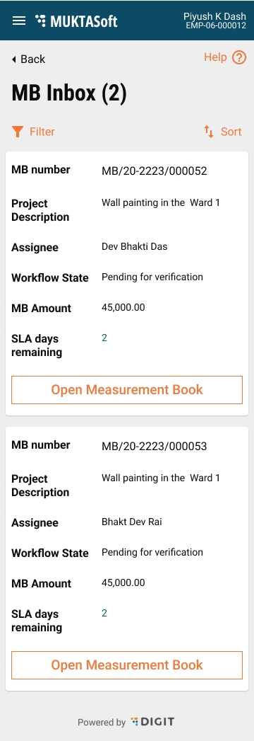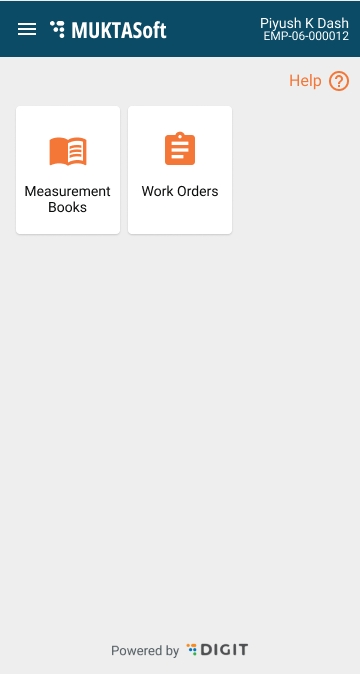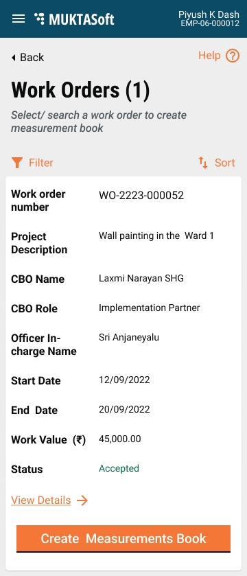 The work orders screen lists the accepted and in-progress work orders to initiate the Measurement Book. Closed project work orders are excluded from the view list.