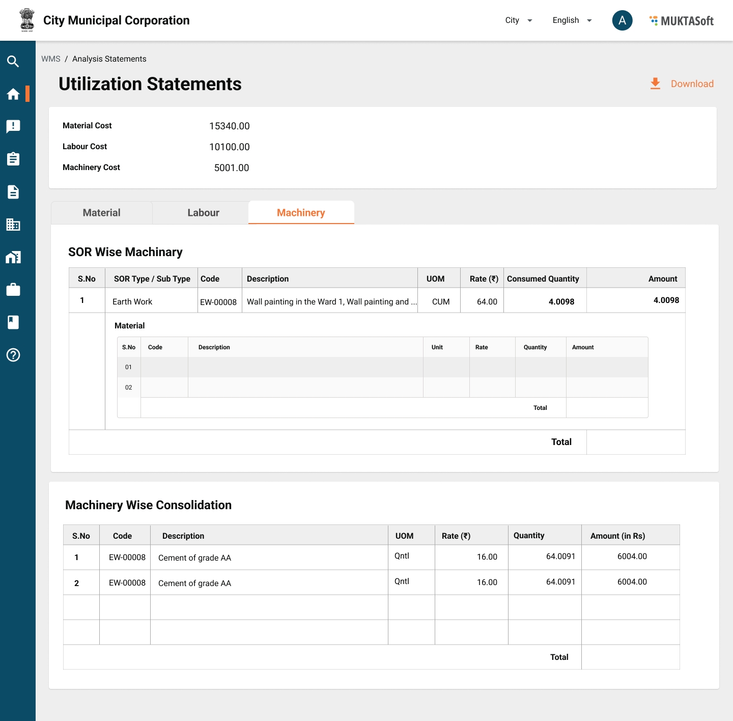Second, get consolidated to have Material Wise, Labour Wise, and Machinery Wise View.