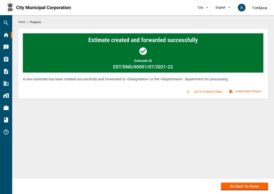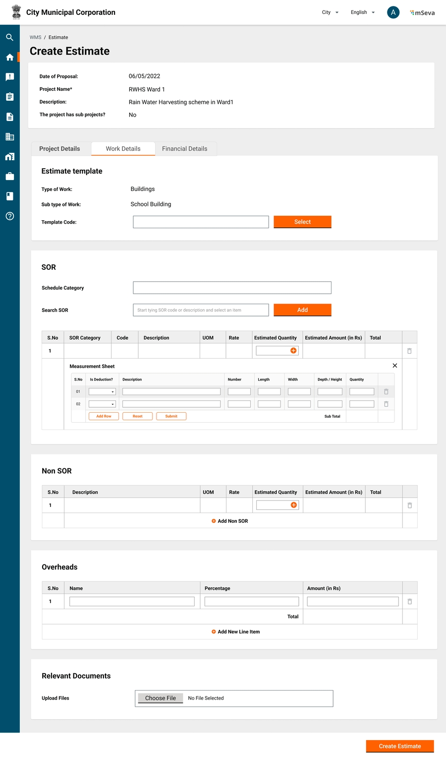 A single line item has the overall project cost against the project title. This requires in-principal Admin sanction. Once approved detailed estimate for the same is created.