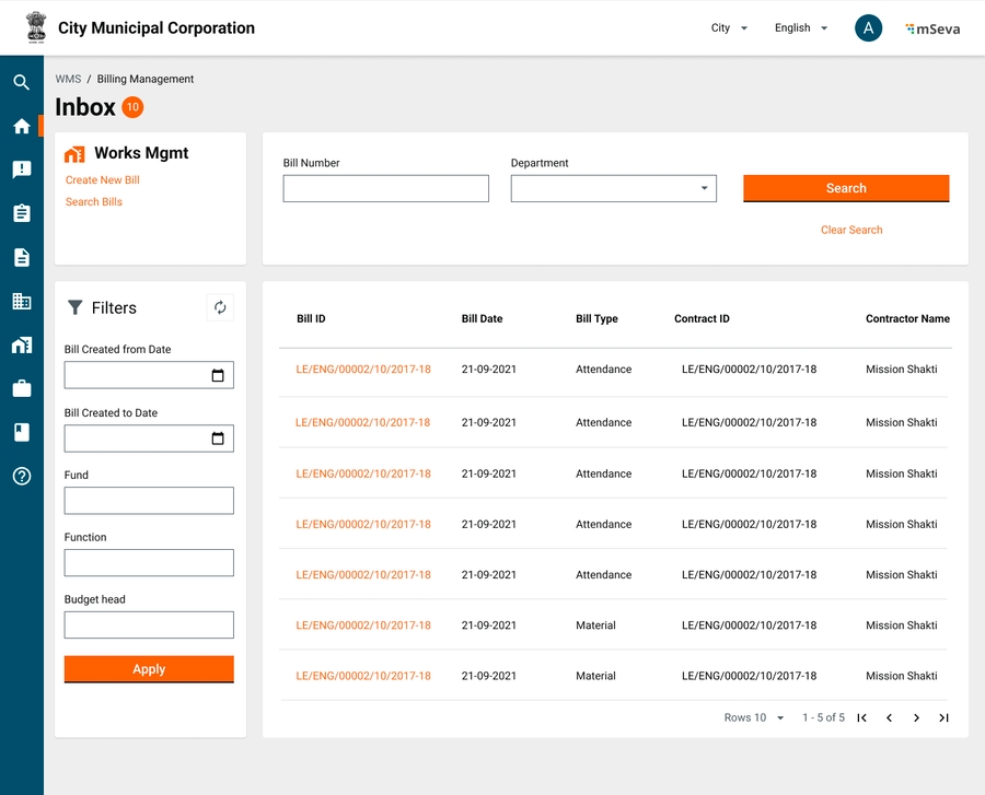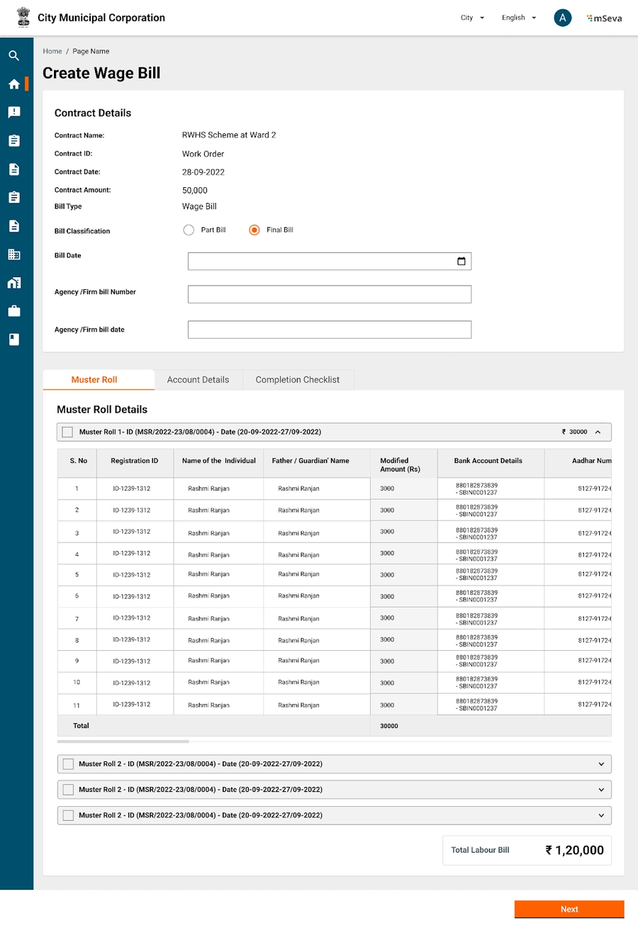 When a user selects to pay a wages bill, the user can select which muster rolls to process as part of this bill, and accordingly bill amount and array of beneficiaries will be processed.