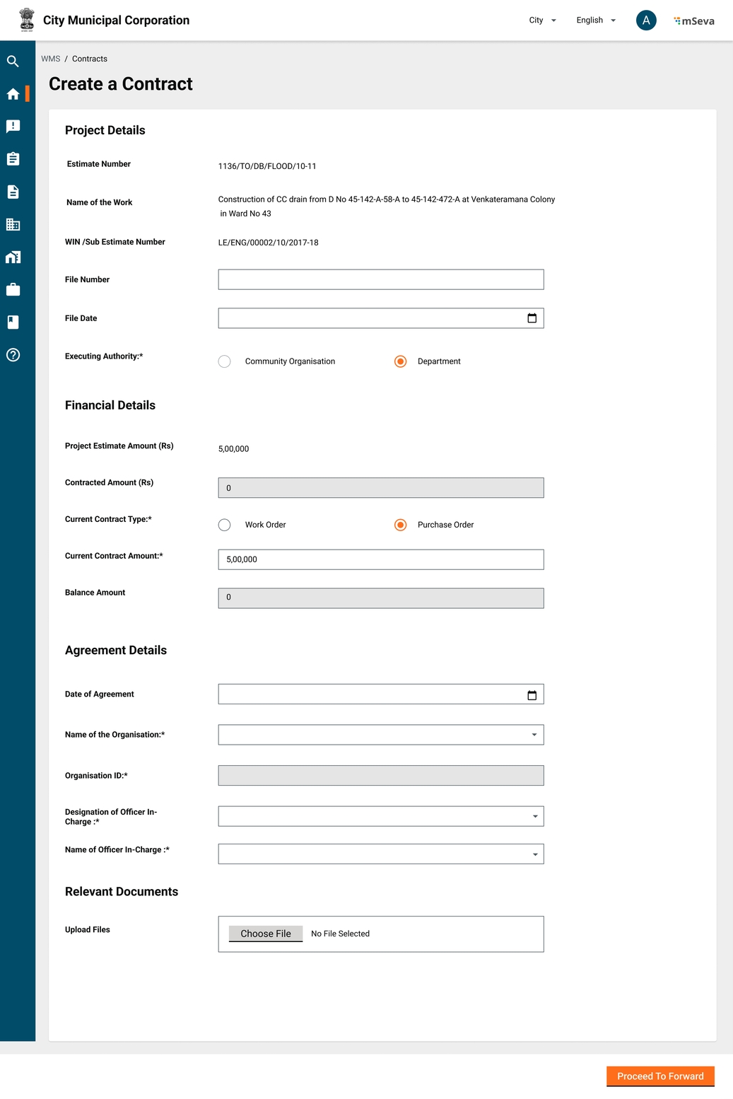 }Once the above details are filled, user needs to forward contract to concerned department and official for checking. Forwarding is considered as part of contract creation.Fill in the details and click “Forward and Approve”.
