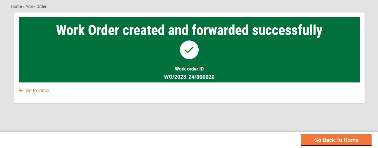 On Forward, the work order is forwarded to the verifier and the success page is displayed with the success message and work order number.