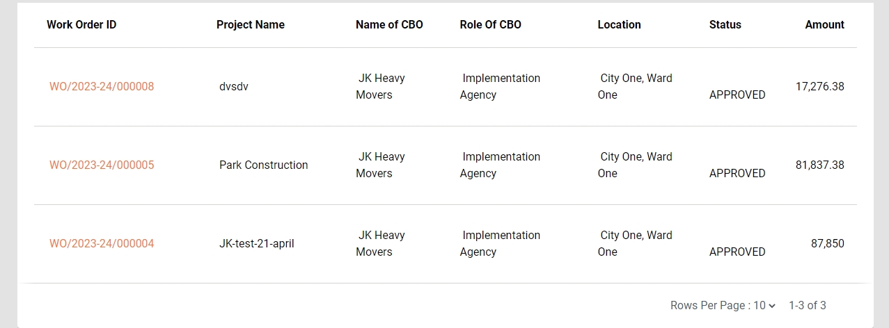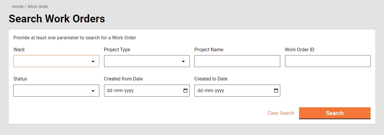 The search work order enables ULB employees to search for a specific work order using different search parameters.