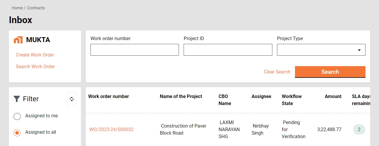 From the Home Page on click of the Work Orders, Inbox Page is displayed.